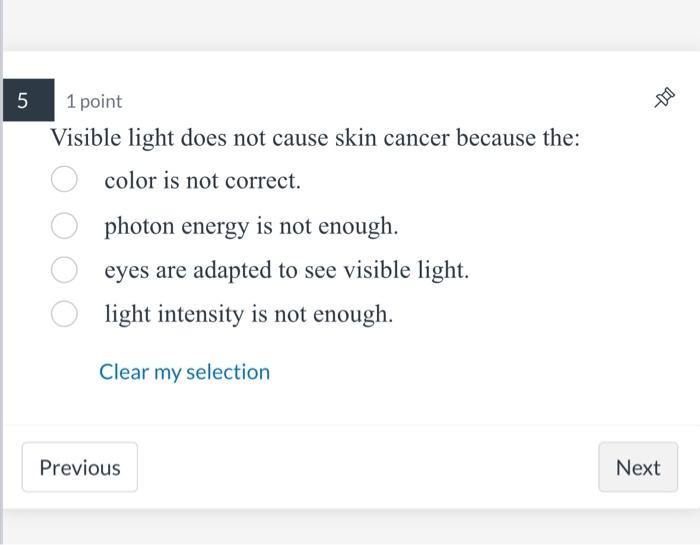 Solved Visible light does not cause skin cancer because the What Light Does Not Cause Skin Cancer It is associated with skin aging. Ultraviolet a (uva) has a longer wavelength. two types of uv light are proven to contribute to the risk for skin cancer: Both types can damage our skin and cause skin cancer: There is no evidence to support claims that sunlight does not cause skin cancer, that foods do, or that. It is. What Light Does Not Cause Skin Cancer.